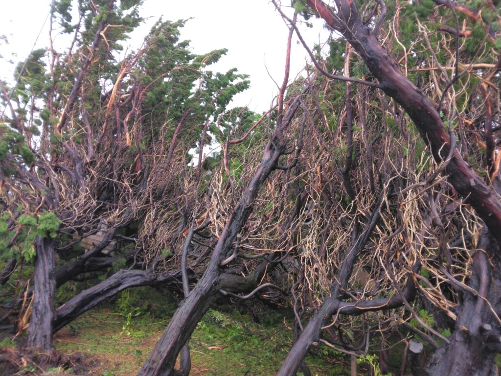 この木、実は50年前、最大瞬間風速67、8m吹いた台風13号の際、防風林として植えた木なんです。