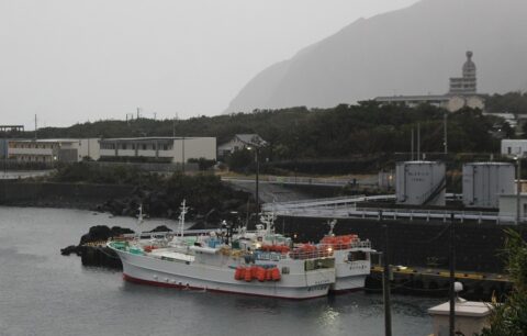 今日の画像は午前5時39分。今朝の八丈富士と神湊漁港です。