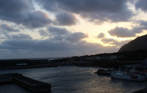 今日の画像は午前7時19分。今朝の八丈富士と神湊漁港です。今朝はくもり。風も無く穏やかな朝です。