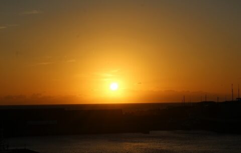 今日の画像は午前6時39分。今朝の八丈富士と神湊漁港です。今朝はくもりです。