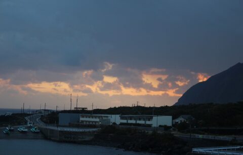 今日の画像は午前5時45分。今朝の八丈富士と神湊漁港です。今朝は晴れ。風が出てきましたね。
