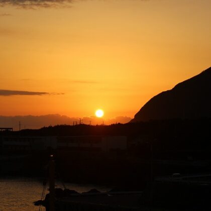 今日の画像は午前6時17分。今朝の八丈富士と神湊漁港です。今朝はくもり空です。