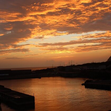 今日の画像は午前6時03分。今朝の八丈富士と神湊漁港です。今朝は台風7号通過中です。