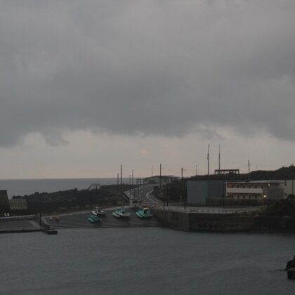 今日の予報は、くもり時々晴れ 所により雨で雷を伴う 南東の風のちやや強く 波3mうねりを伴う 最高気温30度です。今朝の飛行機、定期船共に条件付きです。