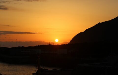 今日の画像は午前6時00分。今朝の八丈富士と神湊漁港です。今朝も大時化です。
