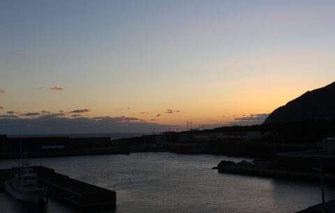 今日の画像は午前6時19分。今朝の八丈富士と神湊漁港です。今朝は雨上がり。今日からムロアジ製造開始です!