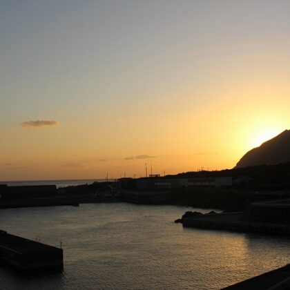 今日の画像は午前7時39分。今朝の八丈富士と神湊漁港です。今朝はくもが多いですね。