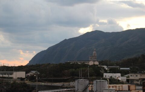 今日の画像は午前5時38分。今朝の八丈富士と神湊漁港です。今朝も小雨です。