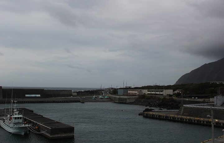 今日の画像は午前6時18分。今朝の八丈富士と神湊漁港です。今朝は風が強いですね。