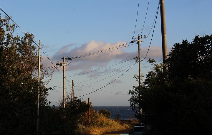 今日の予報は、晴れ時々くもり 明け方雨 西の風強く 波4mうねりを伴う 最高気温22度です。今朝の飛行機は条件付き、定期船は欠航です。