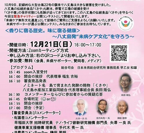 八丈島の各家庭で作られれている「くさや」を知り、これは価値のある伝統食品であり、継続してもらわねばならないなと思っております。落ち着きましたら、伝統的な「くさや作り」を未病ケア無形文化遺産として発表してもらいませんか。