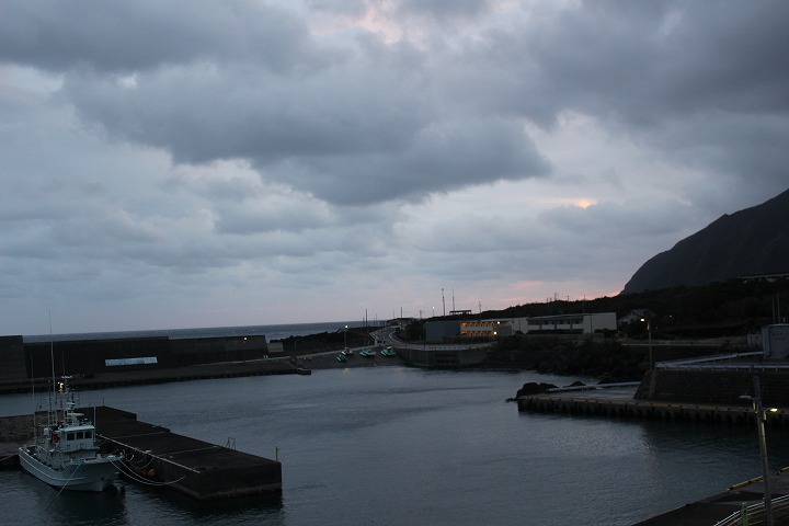 今日の画像は午前6時38分。今朝の八丈富士と神湊漁港です。今朝は小雨です。