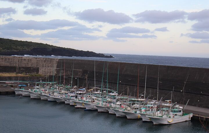 今日の画像は午前6時58分。今朝の八丈富士と神湊漁港です。今年はくもり空です。