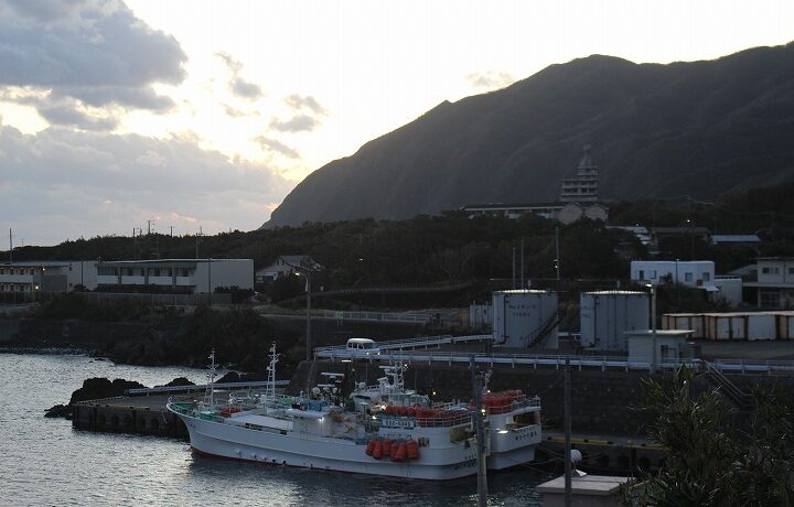 今日の画像は午前6時37分。今朝の八丈富士と神湊漁港です。今朝はくもりです。